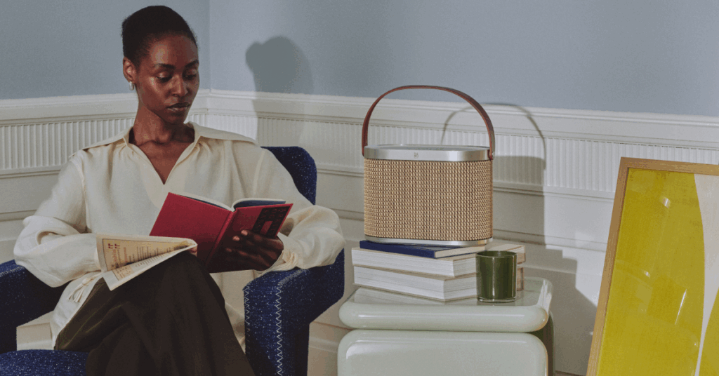 Beosound A5 — потужна портативна колонка з Wi-Fi і Bluetooth, тривалим часом автономної роботи та бездротовою зарядкою, створена для легкого прослуховування вдома чи на природі.
