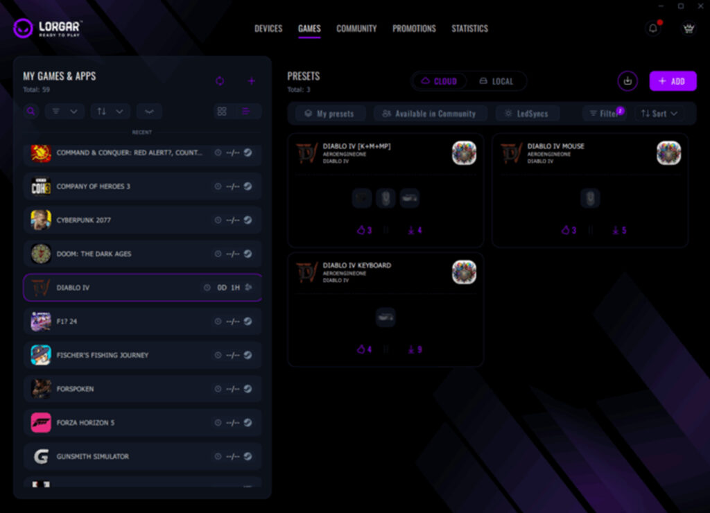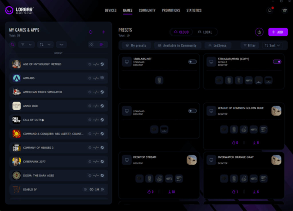 Ваша бібліотека ігор у LORGAR PLATFORM – це командний центр для всього вашого ігрового налаштування. Ліва бічна панель показує все, що встановлено у вашій системі, автоматично відсортоване за платформою. Steam, Epic Games, Riot Games, Battle.net. Профіль Diablo IV PLATFORM відстежує ваш фактичний час гри, корелює час гри з вашою статистикою продуктивності та використанням пресетів. Ви буквально можете бачити, які конфігурації працюють найкраще для яких ігор на основі реальних даних.