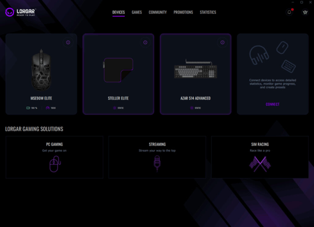 LORGAR PLATFORM легко керує кількома пристроями. Маєте три продукти LORGAR в системі? Усі вони з’являються у вкладці Devices зі своїми власними плитками, з індикаторами батареї та статусом у реальному часі, як-от DPI миші. Кожен пристрій підтримує свій власний профіль, але працюють вони разом як єдина система.